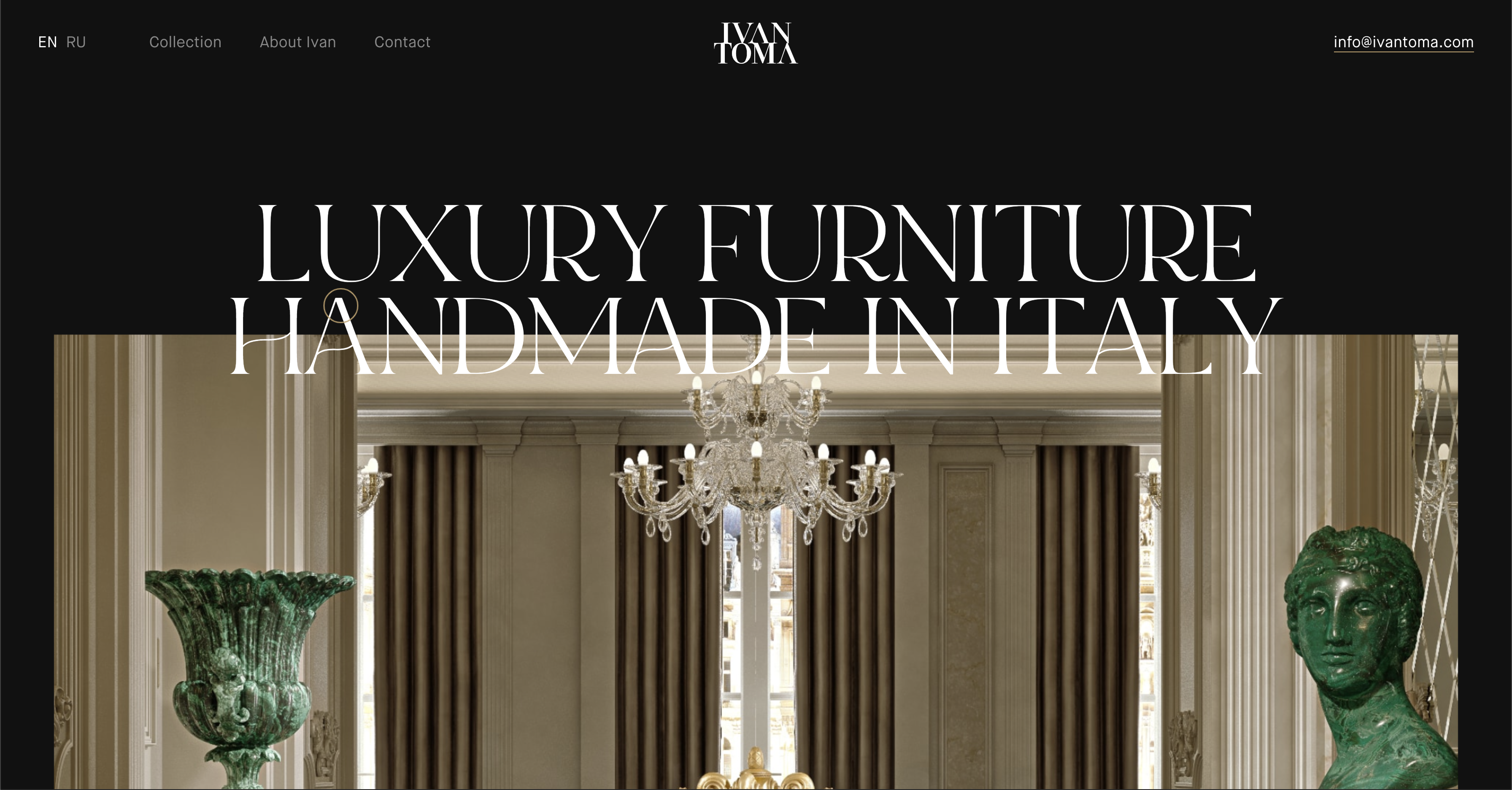 이태리의 핸드메이드 럭셔리 가구 브랜드 IVANTOMA 사이트는 고풍스러운 이태리가구와 가장 잘 어울리는 명조체를 전반에 사용하여 타이포와 이미지를 레이어드 배치하여 하나의 잡지를 넘겨보는 듯한 분위기를 자아냅니다.