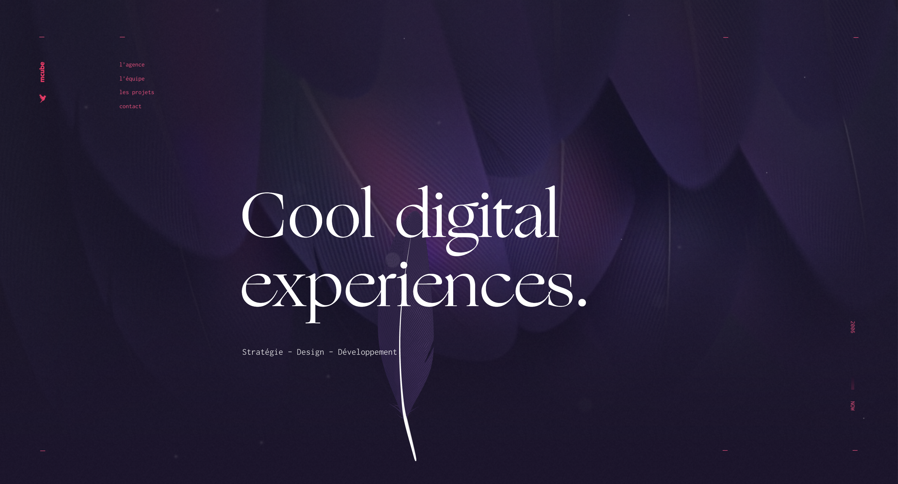 다크 톤의 컬러 패턴 배경 이미지에 포인트 명조 타이포가 눈길을 끄는 사이트입니다. 에이전시의 웹사이트로 새의 깃털을 모티브로 한 감각적인 디자인과 모션이 눈에 띄네요. 명조 폰트가 고급스러우면서도 묵직하고 무드있는 느낌을 주는 듯 합니다.