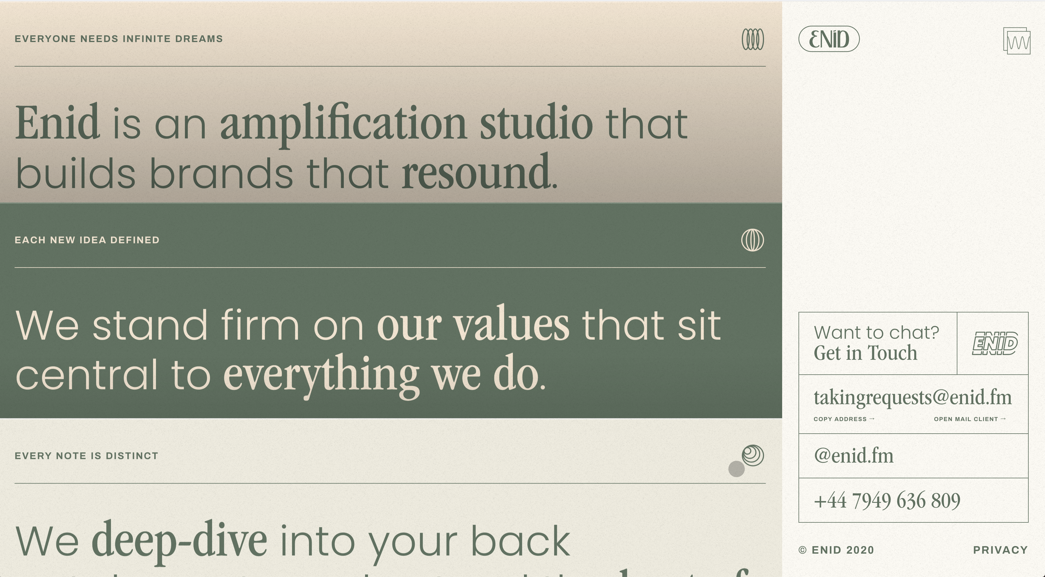 가판대에 진열된 신문을 닮은 레이아웃의 ENID 사이트입니다. 각 콘텐츠의 타이틀만 보여지는 레이아웃으로 클릭 시 페이지 이동 모션까지 마치 잡지를 꺼내 보는 듯한 경험을 줍니다.