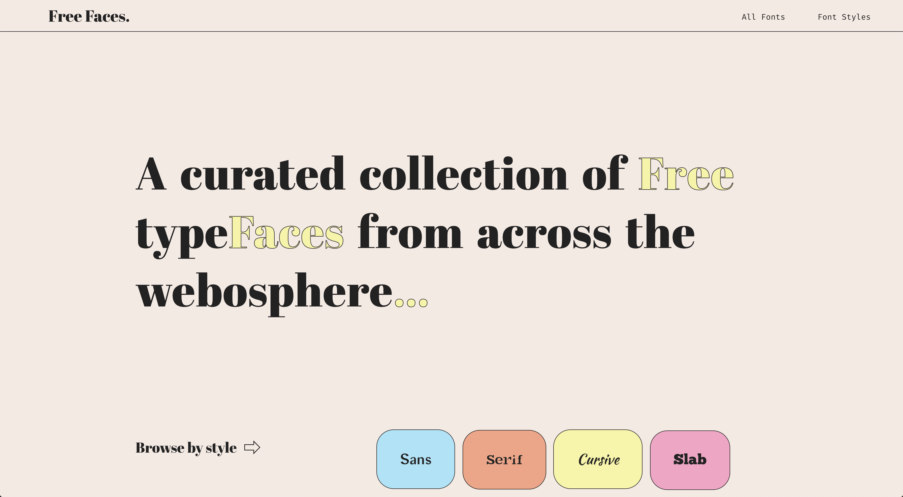 명조 폰트로 일부 글자에 포인트 컬러를 주어 디자인 요소로 활용한 귀여운 느낌의 웹사이트입니다. 다양한 폰트를 안내하는 사이트로 하단의 폰트 스타일에 따른 카테고리를 직관적인 버튼으로 구현하였습니