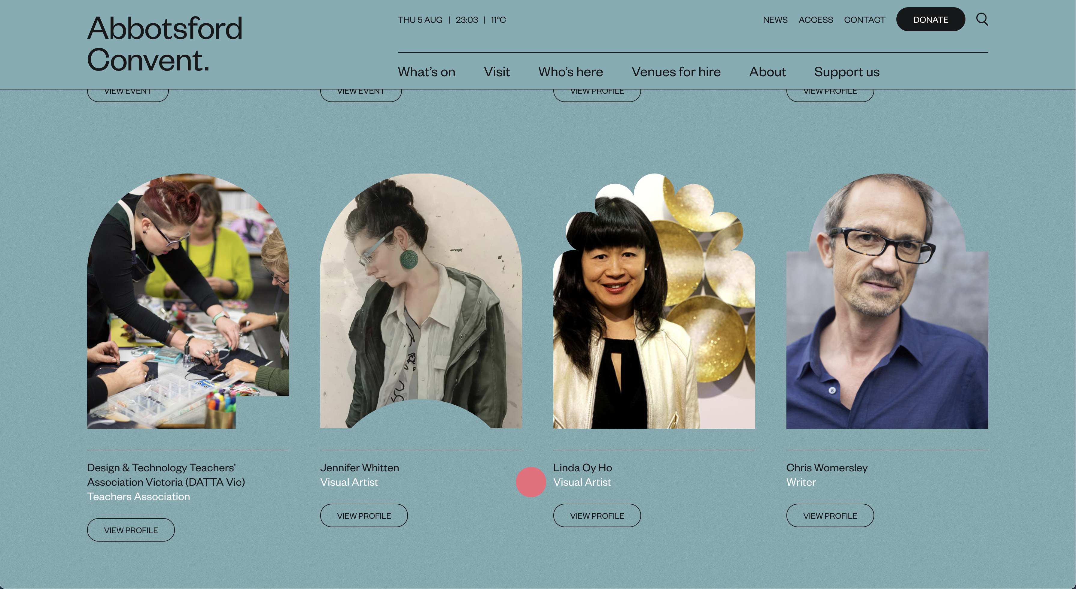 또한 Abbotsford Convent 사이트에서는 아치형태의 이미지와 더불어 앞서 이야기한 노이즈 텍스처를 웹사이트의 백그라운드 그래픽으로 설정하여 마치 오래된 브라운관 TV에서 재생되고 있는 이미지처럼 약간의 움직임으로 레트로 감성과 함께 재미를 더하고 있습니다.