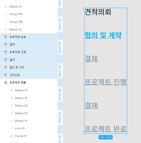 각각 텍스트 레이어로 만들어 어느정도 정렬을 해 두었으나, 메뉴를 추가 할 때 동일한 간격으로 자동 정렬되도록 하고싶습니다.