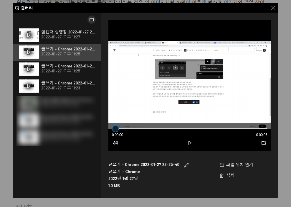 다시 window key + G 단축키를 눌러 캡처 화면을 불러오면 가운데 뜨는 팝업 창에 녹화된 파일 리스트가 나타납니다.