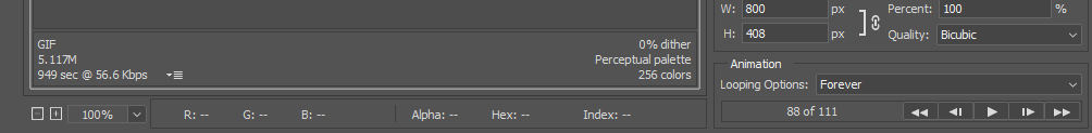 좌측 5.117M라고 적혀있는 부분이 파일 용량 표시입니다. 우측 재생 버튼을 통해 gif 재생되면서 이미지가 많이 깨지지는 않는지 색상은 잘 표현되는지도 잘 확인합니다.