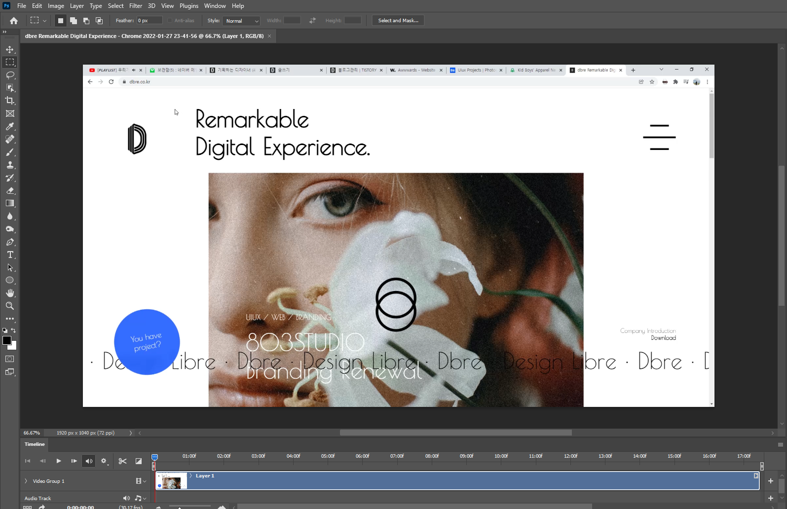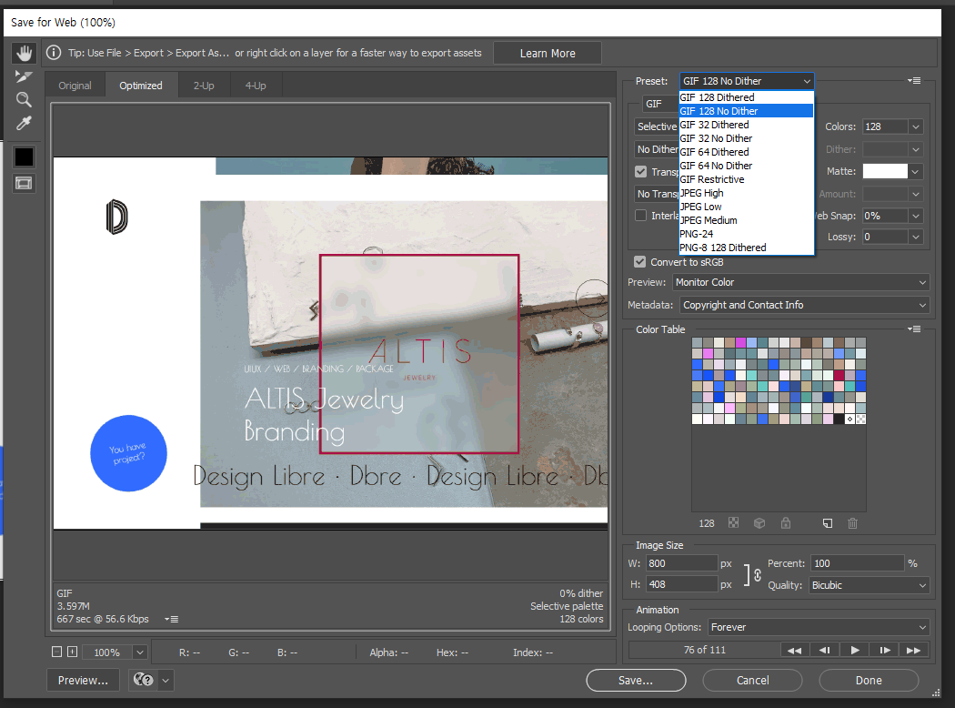 800px 정도로 작업한 gif 이미지는 포트폴리오 업로드 시 가로사이즈를 100%로 맞추어 늘려 업로드하더라도 큰 거부감이 없는데 그 이유는 gif화 한 동영상은 그래픽이 깨지는 것은 불가피하기에 어느 정도 허용 가능한(주관적으로) 화면 깨짐의 사이즈라고 볼 수 있습니다.
