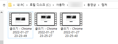 기본 저장 경로는 내 PC > 로컬디스크(C:) > 사용자 > 사용자명 > 동영상 > 캡처 입니다.