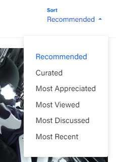 하지만 특정 지역으로 필터링 해도 여전히 추천순으로 알고리즘을 통해 추천된 포트폴리오만 확인이 되는데요, 여기서 상단 우측의 sort 부분에서 Recommended로 되어있는 셀렉트 박스를 클릭하면 다양한 옵션으로 sorting이 가능합니다.