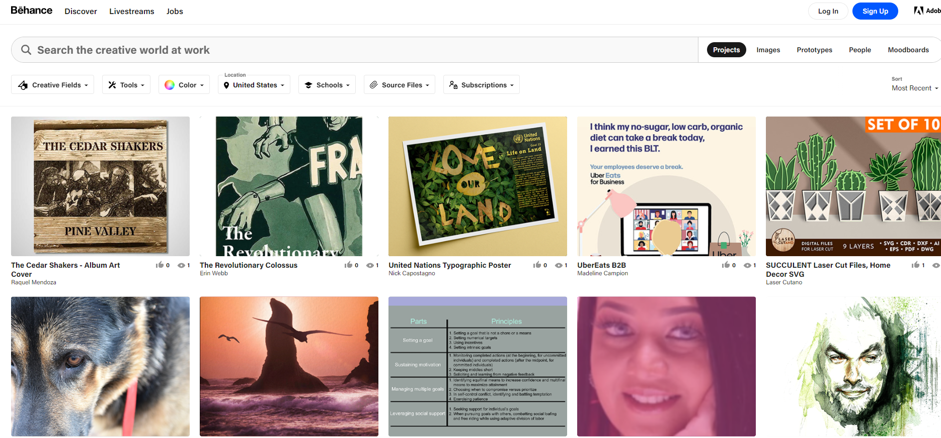 하지만 특정 지역으로 필터링 해도 여전히 추천순으로 알고리즘을 통해 추천된 포트폴리오만 확인이 되는데요, 여기서 상단 우측의 sort 부분에서 Recommended로 되어있는 셀렉트 박스를 클릭하면 다양한 옵션으로 sorting이 가능합니다.
