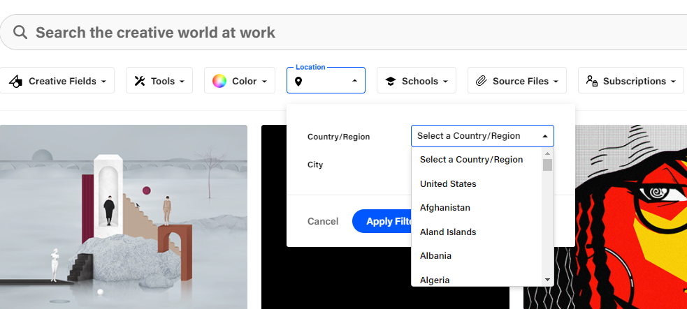 검색 하단의 필터 셀렉트 박스에서 Location > Country / Region 및 City 를 선택하면 해당 국가와 도시에 업로드된 포트폴리오를 확인할 수 있습니다.