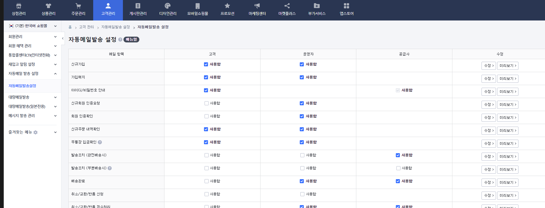 1. 고객관리 > 자동메일발송설정 > 자동메일발송설정 메뉴로 접속합니다.