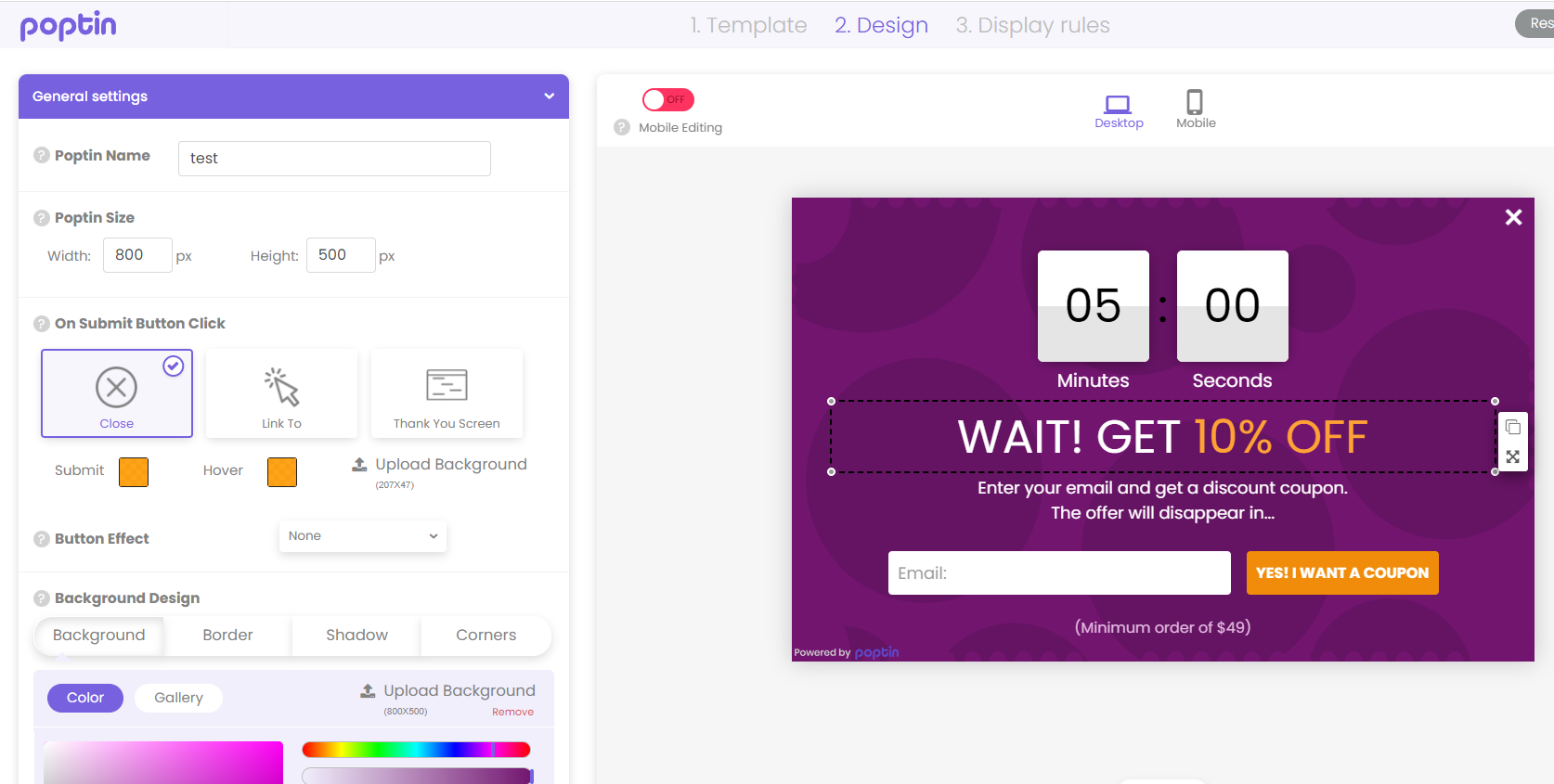 팝틴에서 기본형 팝업 디자인을 선택 후 팝업 디자인의 내용과 버튼 컬러로 간단하게 팝업 디자인을 만들어볼 수 있습니다. 디자인 생성을 완료한 뒤 우측 상단의 NEXT 버튼을 클릭하여 'display rules'를 설정할 수 있는 메뉴로 접근이 가능한데요.