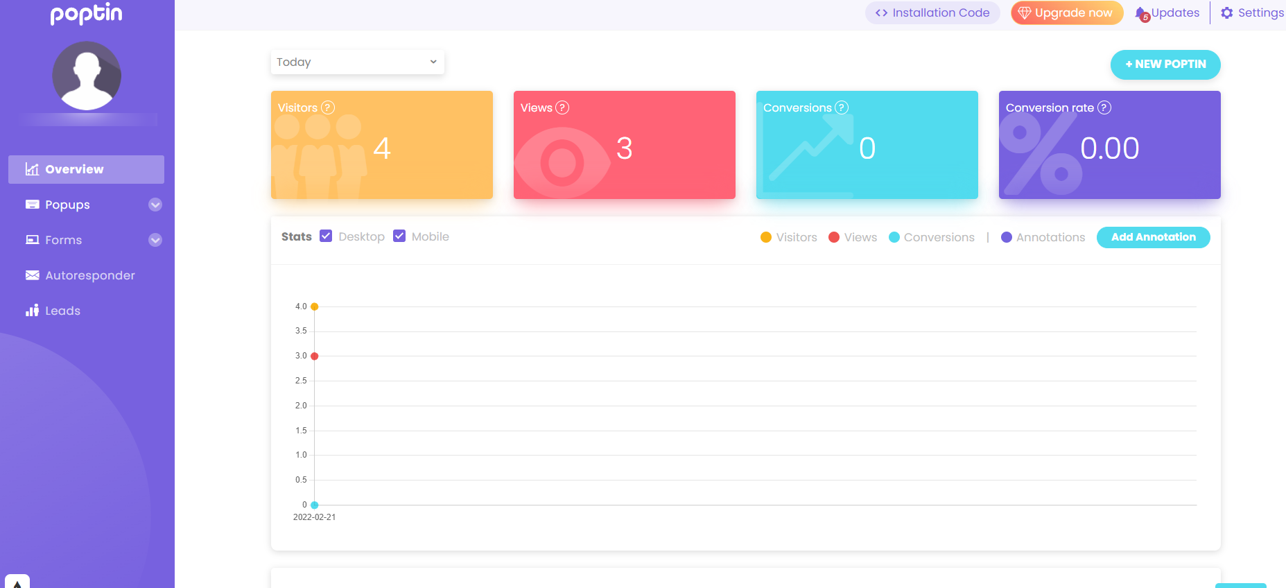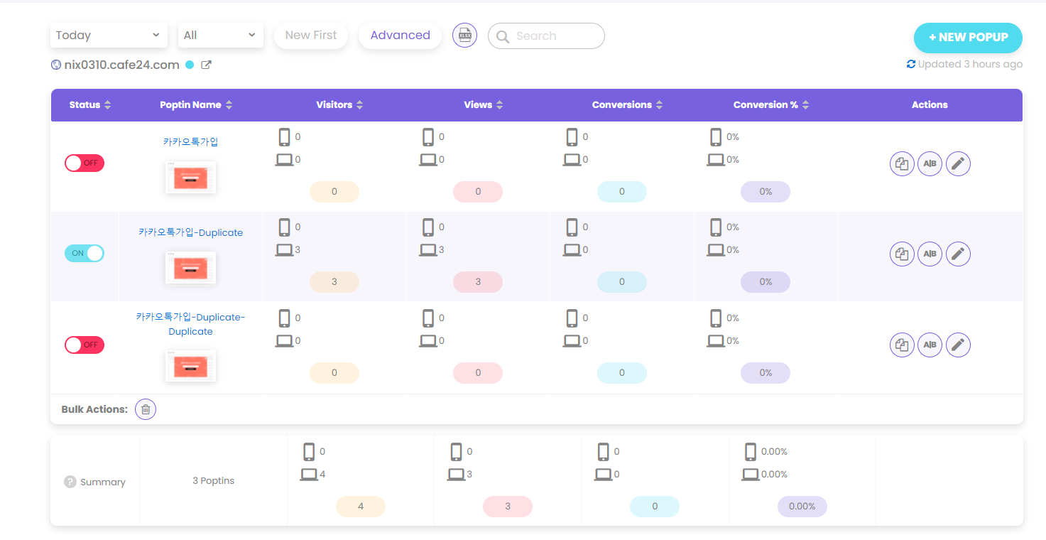 왼쪽 메뉴 중 POPUP 탭을 누르면 생성된 팝업 리스트가 뜨는데, 아직 생성이 되지 않았을 경우 관맂라 화면의 우측 상단 +NEW POPUP 버튼을 클릭하여 새로운 팝업을 생성할 수 있습니다.