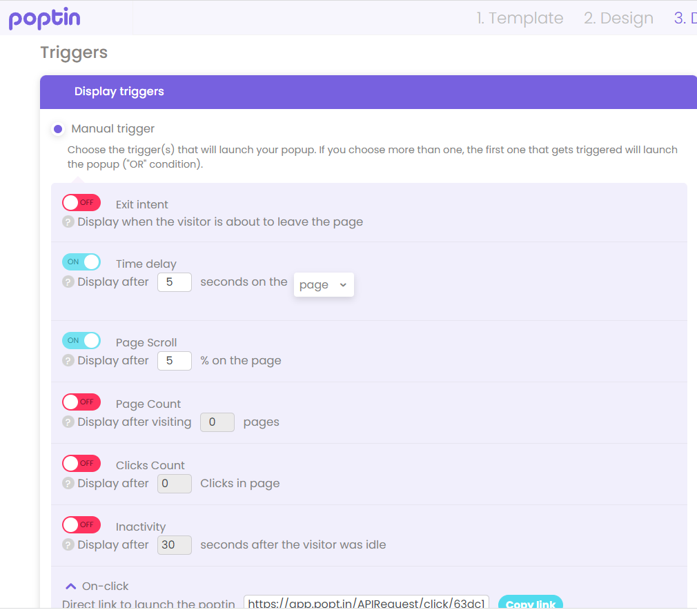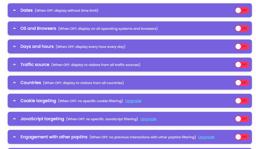 몇 분 간격으로 팝업을 띄워줄 지, 페이지 스크롤은 얼마나 내리면 팝업을 띄워줄 지, 페이지 내 몇번의 클릭 뒤에 팝업을 띄울 지 등 고객의 행동과 관련하 타겟화된 팝업의 UX 설정이 가능합니다.