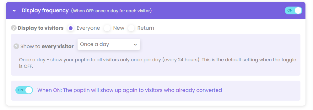 하단의 display frequency 메뉴를 통해 방문자 모두에게 보여줄지, 새로 들어온 사람만 보여줄지, 재방문 고객에게 띄워줄지 등을 설정도 가능합니다.