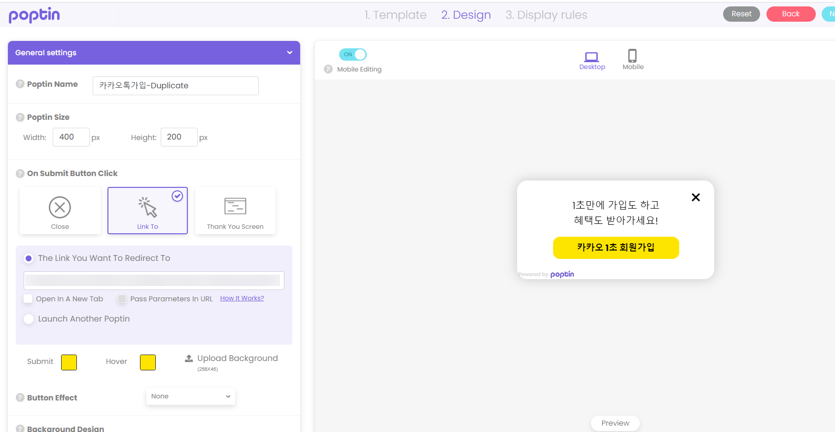팝틴에서 기본형 팝업 디자인을 선택 후 팝업 디자인의 내용과 버튼 컬러로 간단하게 팝업 디자인을 만들어볼 수 있습니다. 디자인 생성을 완료한 뒤 우측 상단의 NEXT 버튼을 클릭하여 'display rules'를 설정할 수 있는 메뉴로 접근이 가능한데요.