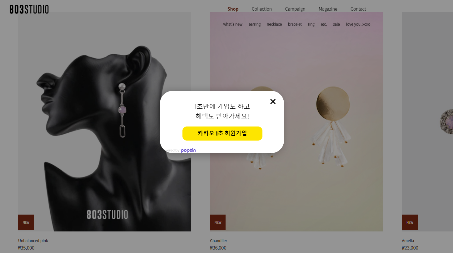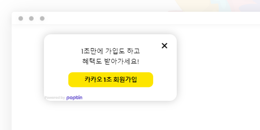 최근 국내 쇼핑몰에서 가장 대표적으로 활용되는 팝업 사례는 '카카오톡 1초 회원가입' 팝업이 있습니다.