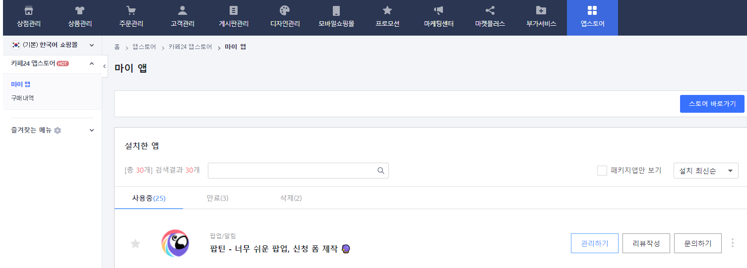 cafe24 앱스토어에서 '팝틴'을 검색하여 설치 후 나의 앱스토어 관리자 마이앱에 보시면 설치한 앱 리스트에 설치된 것을 확인 할 수 있습니다.