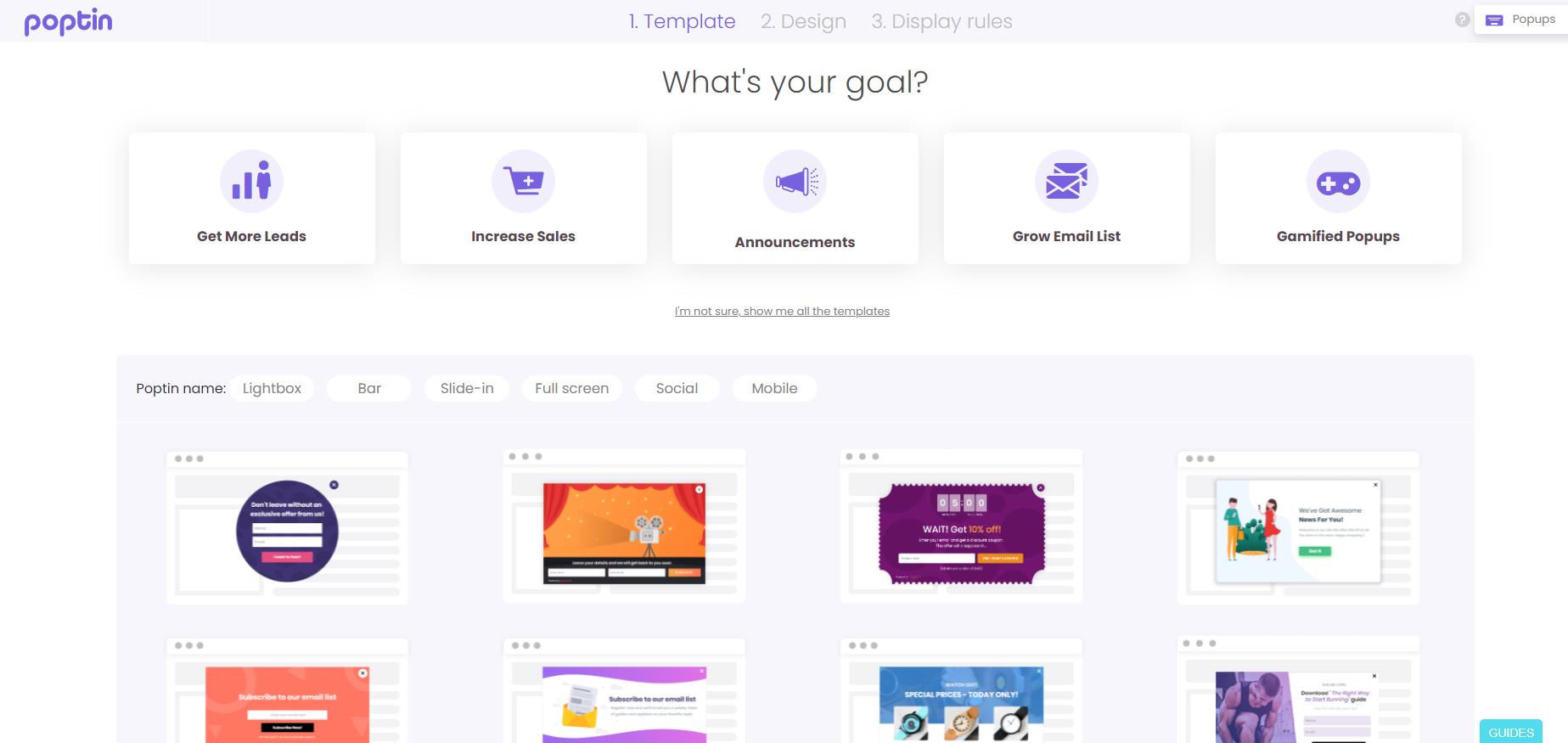새 팝업 만들기를 진행하면 제공되는 다양한 템플릿을 이용하거나 별도로 html 코드를 넣어 나만의 팝업 디자인을 만들 수 있습니다. poptin은 해외 서비스가 국내에 도입된 사례라 cafe24의 쇼핑 데이터 맞춤형이라기보다는, 접속자와 브라우저와의 관계성에서 조건 설정이 다양하게 가능하다고 볼 수 있습니다.