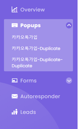 왼쪽 메뉴 중 POPUP 탭을 누르면 생성된 팝업 리스트가 뜨는데, 아직 생성이 되지 않았을 경우 관맂라 화면의 우측 상단 +NEW POPUP 버튼을 클릭하여 새로운 팝업을 생성할 수 있습니다.