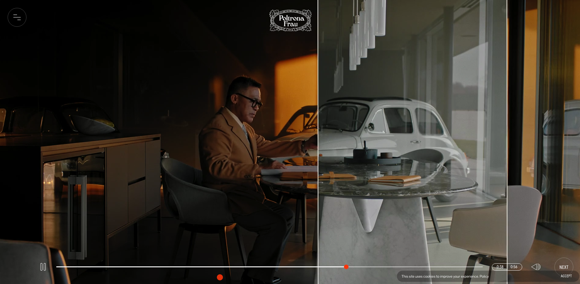 poltronafrau 사이트의 주요 콘텐츠는 동영상이지만, 메뉴를 클릭하면 배경에서는 그대로 동영상이 재생되고 있는 중에 투명한 레이어 위로 펼쳐지는 메뉴의 레이아웃이 눈여겨볼만 합니다.