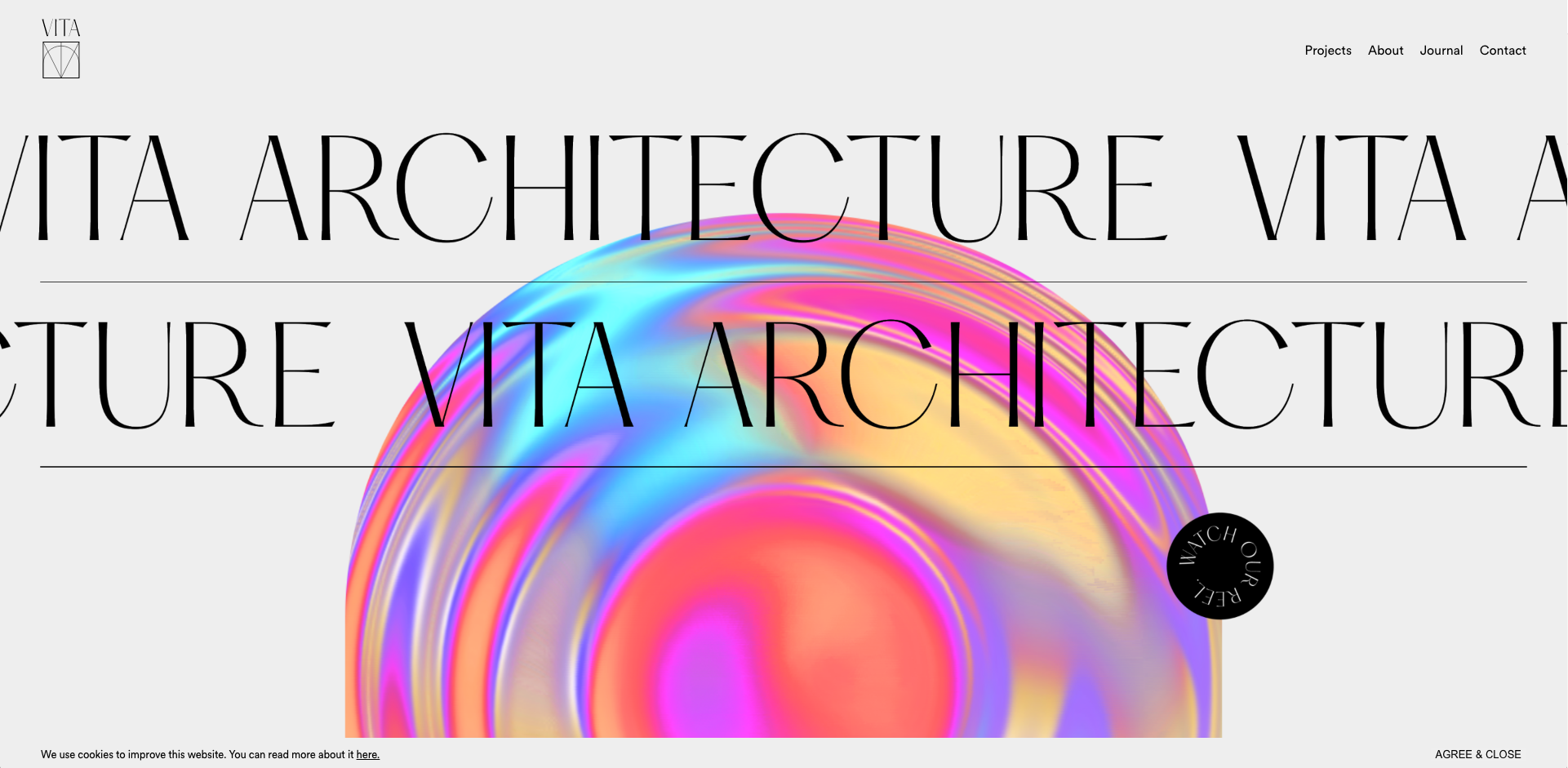 vararchitecture 사이트에서 역시 자동 재생되는 백그라운드와 함께 좌우로 텍스트가 흐르는 효과를 시작으로 하단 스크롤 시 콘텐츠가 떠오르는 floating 효과와 다양한 인터랙션이 나타납니다.