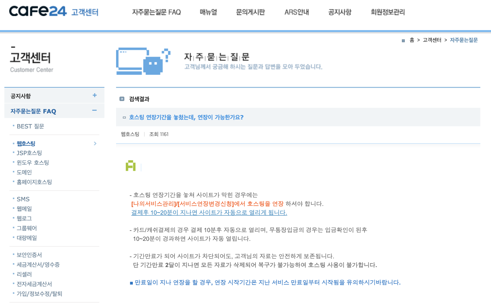 사용하던 cafe24 호스팅이 만료되었고, 2개월이 지났다는 안내 문구가 나온다면?