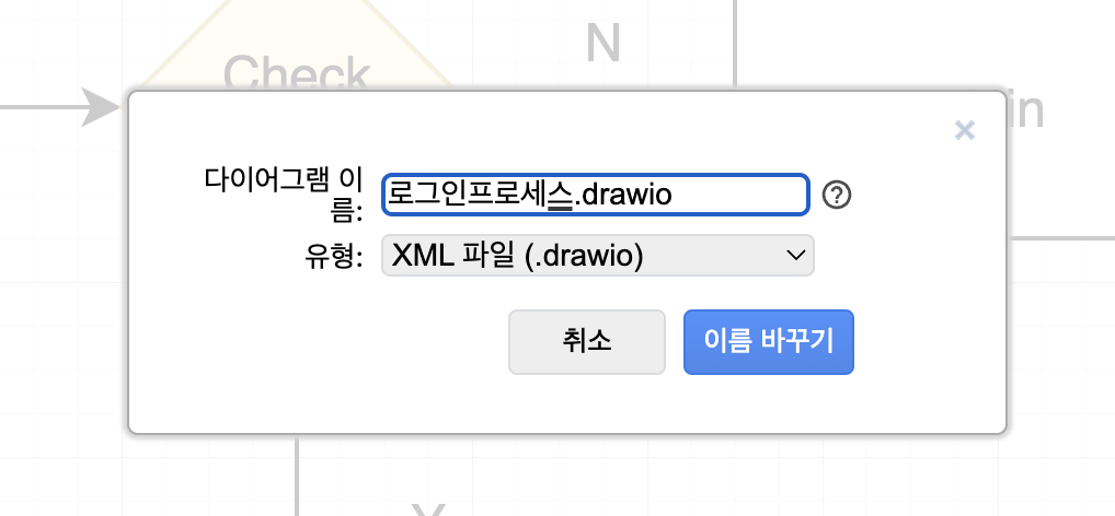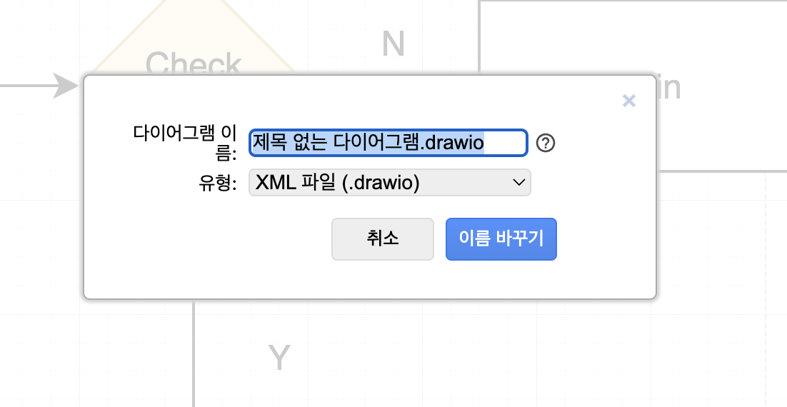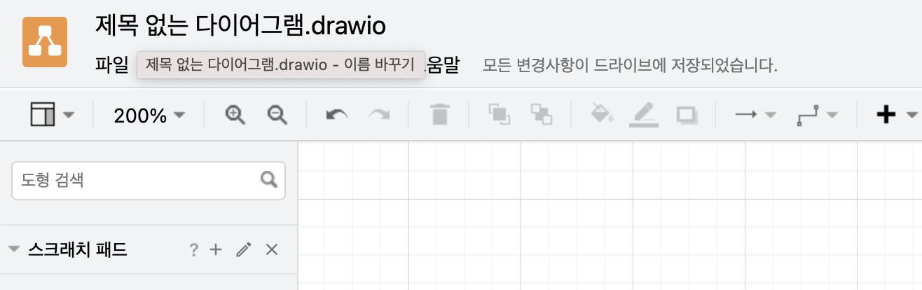 웹 기반의 프로그램이므로 별도의 저장 없이도 연결된 구글 드라이브에 자동 저장이 되며, 완료된 플로우차트의 파일명을 변경하고자 할 때는 제목없는 다이어그램.drawio 부분에 마우스를 클릭하면 파일명을 변경할 수 있습니다.