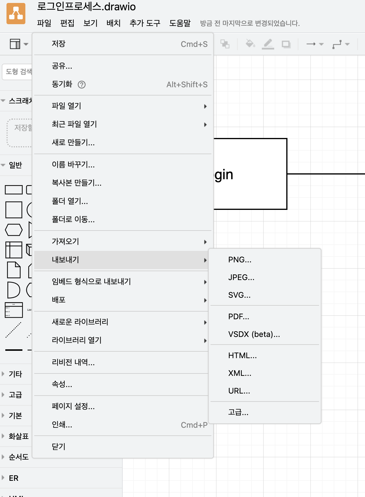 완료된 플로우차트를 이미지로 저장하고자 할 경우, 파일 - 내보내기 - 유형 선택을 통해 가능합니다.