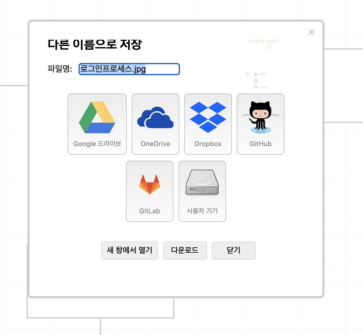 기본 플로우차트 원래 유형의 .drawio 파일은 최초 선택한 구글 드라이브에 저장되지만, 내보내기를 통해 추출한 파일의 저장 공간은 별도로 선택이 가능한데 보통은 사용자기기에 저장하여 작업중인 파일에 이미지 첨부로 진행합니다.