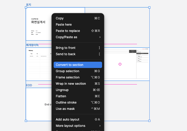다만 프로젝트 산출물인 문서화를 위해서는 문서 자체에서 수정이 어렵고 피그마 파일로 옮겨 추출 후에 다시 수정해야 한다는 단점은 있는데요. 프로그램을 파워포인트에서 피그마로 옮긴 것 뿐이라는 점 외에는 단순히 익숙하지 않은 것에 대한 불편함 정도 외에는 매력적인 툴인 것은 확실합니다.