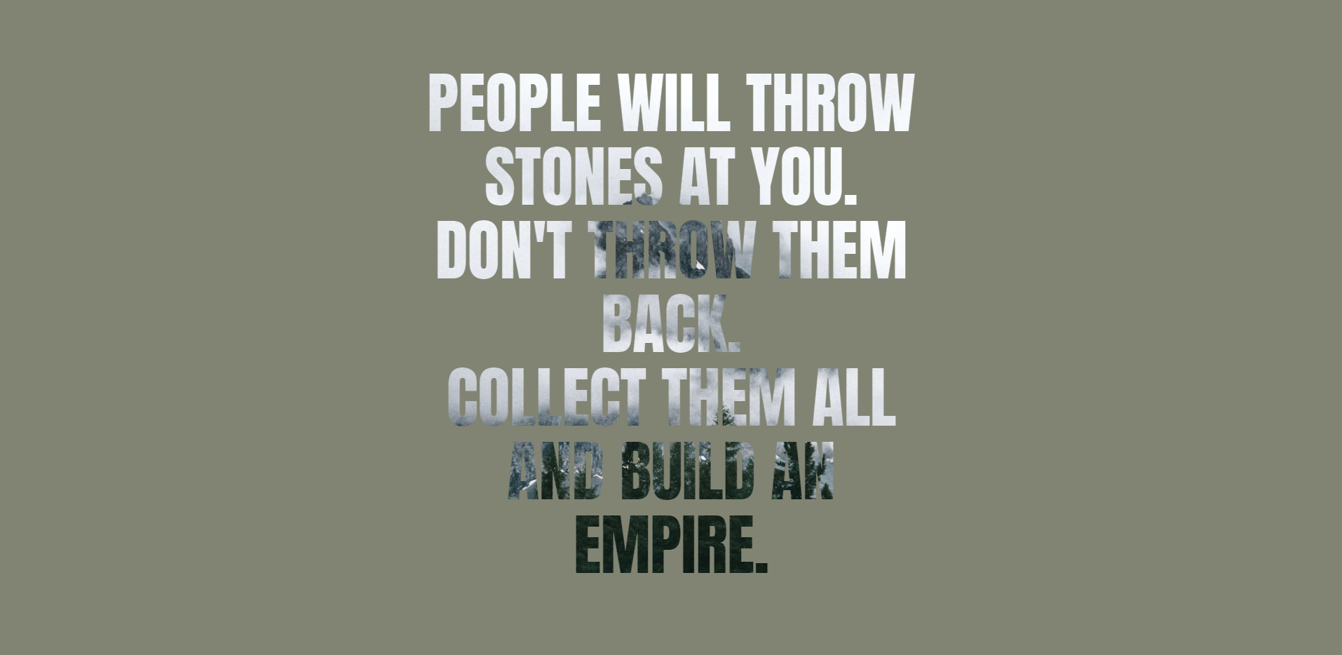 배경이미지가 텍스트 컬러로 적용되는 크롭 스타일의 텍스트 디자인 적용 예제입니다. 텍스트를 많이 입력하여 스크롤이 생기면 백그라운드 이미지를 고정시켜{background-attachment:fixed;} 텍스트만 스크롤되는 패럴랙스 스타일로도 적용해볼 수 있습니다. People will throw stones at you. Don't throw them back. Collect them all and build an empire. VIEW DEMO